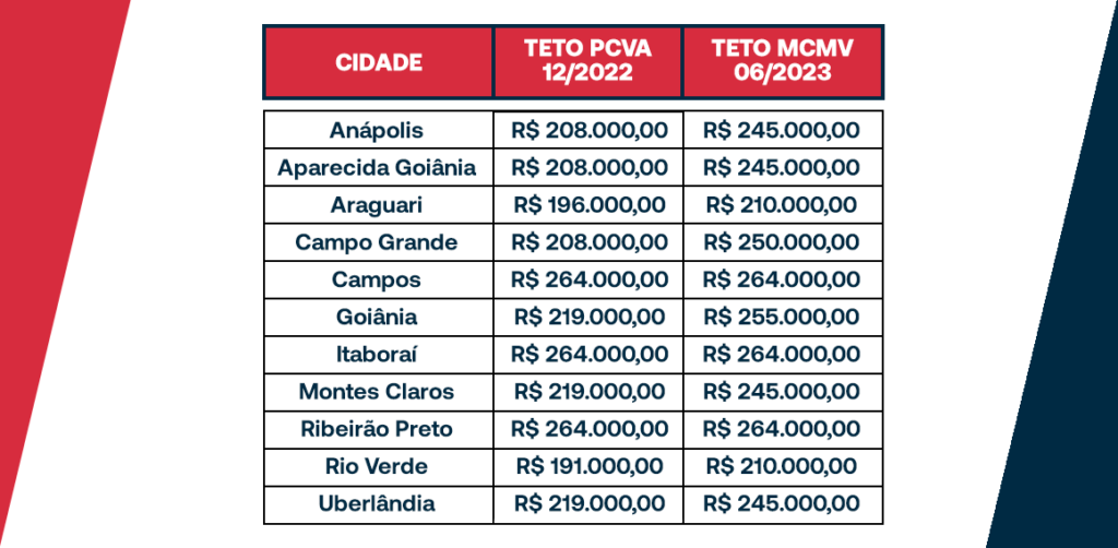 Assim, o teto para a Faixa 3 passou de R$ 264 mil para R$ 350 mil, valendo para todas as cidades do Brasil. Já para as Faixas 1 e 2, ficou entre R$ 190 mil e R$ 264 mil, de acordo com a localização do imóvel.